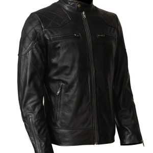 Mens Black Café Racer Leather Biker Jacket Quilted Shoulders