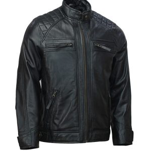 Mens Black Café Racer Leather Biker Jacket Quilted Shoulders